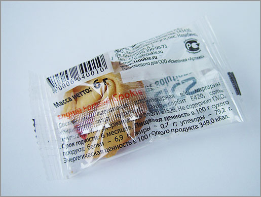 Вы имеете возможность заказать брендированную пленку и в дальнейшем выкупать любые тиражи печенек в своей пленке. Брендирование упаковки возможно только для больших тиражей. При этом, вы можете заказывать любые тиражи печенек - упаковочная брендированная пленка хранится у нас и мы пакуем последующие заказы печенек в вашу пленку. Срок изготовления брендированной пленки 2 недели со дня утверждения макета упаковки и оплаты заказа. Печать пантонная (до 4-х пантонов). Возможна триадная печать (аналог полноцвета), но она подходит не для любых макетов. Пленка либо непрозрачная белая жемчужная либо прозрачная. Ламинация либо глянцевая либо матовая. Печать производится на двухслойном БОПП материале с ламинацией что исключает осыпание краски.